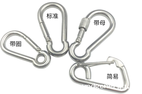 安全钩的结构主要有弹簧舌自动复位式和自锁式两种。 D型安全钩由钩体,锁壁两部分构成,开合机构为弹簧舌自动复位式,锁壁部分有扭转自锁和螺纹手锁两种保险结构设计,自锁结构锁壁上装有旋转压缩弹簧,锁壁套能够自动复位并锁紧,手锁结构锁壁上有螺纹,旋转锁壁套可打开和锁紧安全钩。
