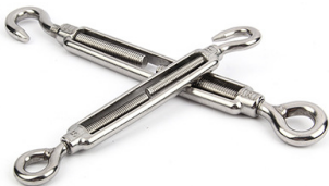 钩环式收紧器又被称为开体花篮、花篮螺丝,是常用的货物捆绑工具,采用不锈钢材质制造而成,防腐蚀防生锈的同时也能让操作者看到它本身的螺纹纹路,在使用收紧器紧固货物过程中,螺栓也会处于紧固的状态,它的轴向拉力不断增大,螺纹之间相互咬合,进一步增大了轴向拉力,在垂直于螺栓的方向,紧固力在与螺纹垂直方向上的分量和摩擦力之和相等后,紧固结束,货物捆绑作业也就圆满结束。